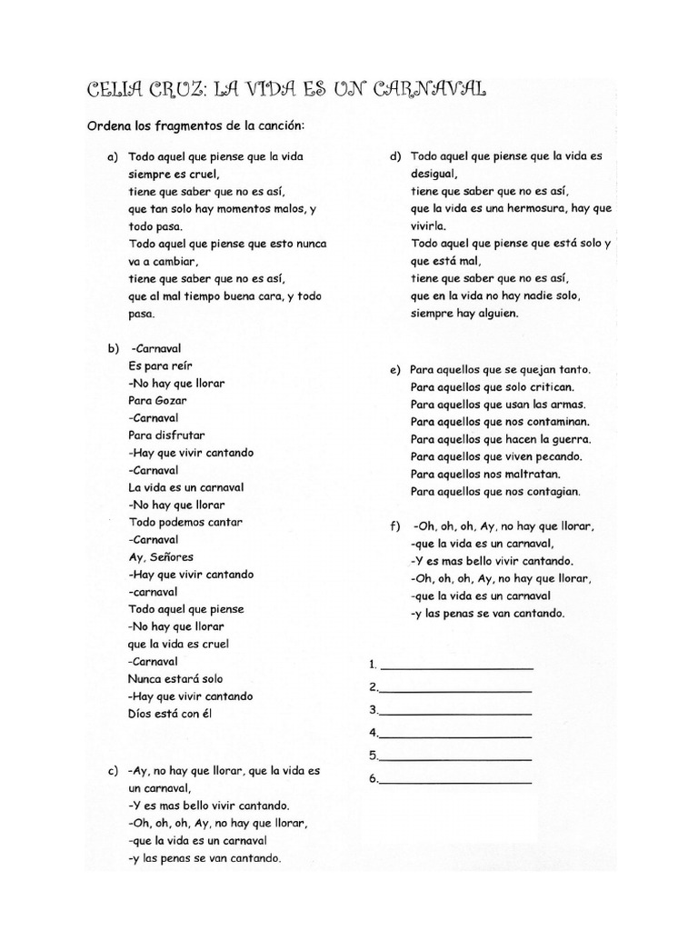 The song won the award for tropical song of the year at the 2003 lo nuestro awards. La vida es un carnaval is a song performed by cuban recording artist celia cruz. Maybe you would like to learn more about one of these? The song was written by victor daniel, produced by isidro infante, arranged by isidro infante and released as the lead single from cruz's studio album mi vida es cantar (1998). Celia cruz la vida es un carnaval. Check spelling or type a new query. We did not find results for: